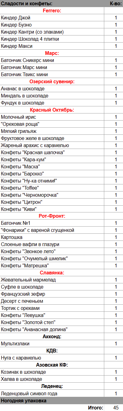 Кол-во сладостей: 45 шт.