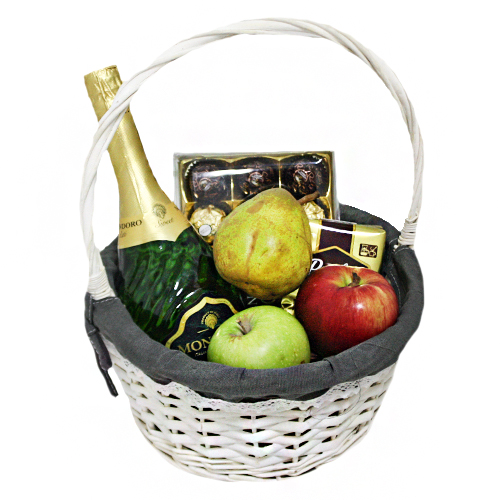 Состав : Корзина, вино MONDORO Asti, конфеты Ferrero Collection 172 гр, кофе Presidento, яблоко 2 шт, груша 1 шт